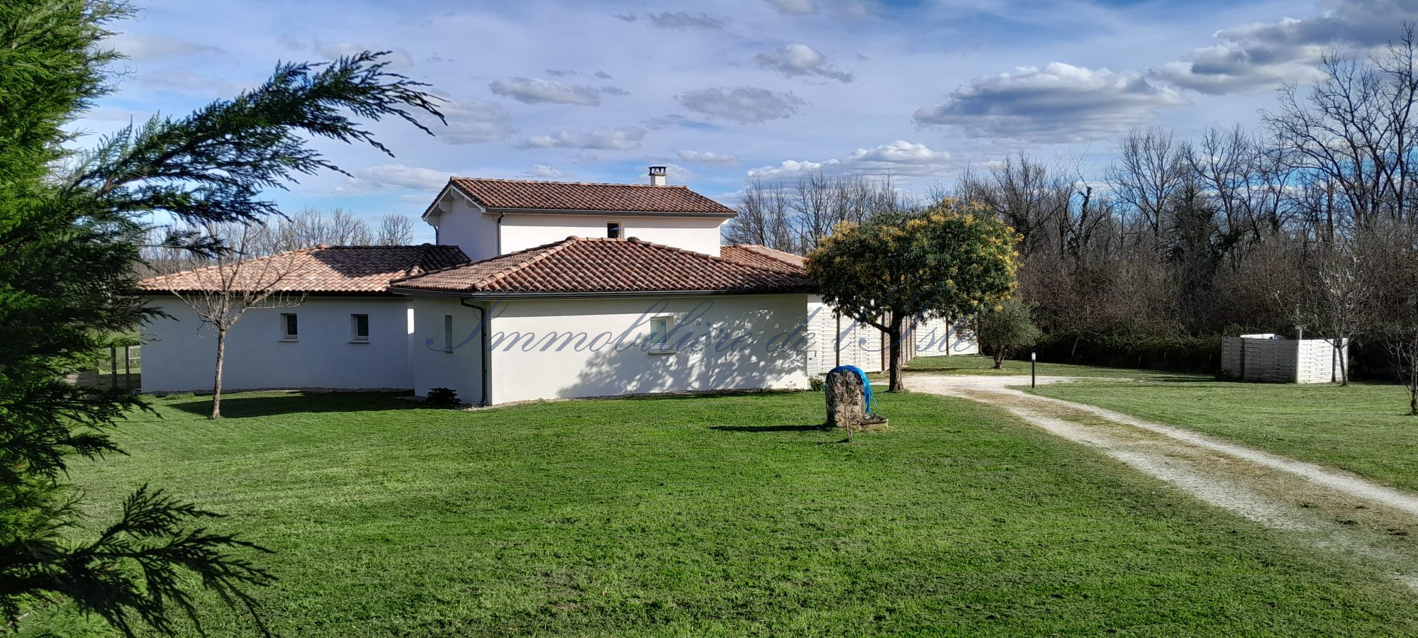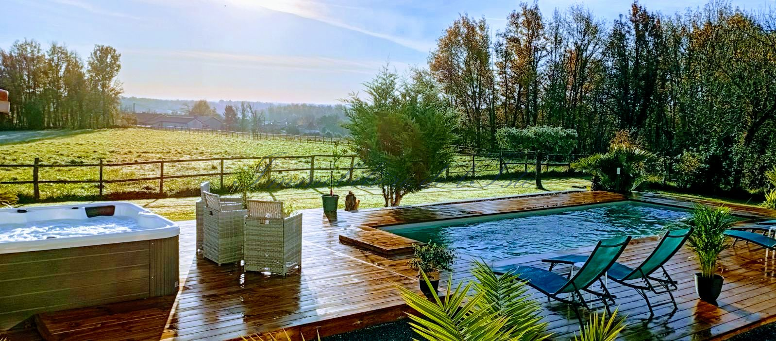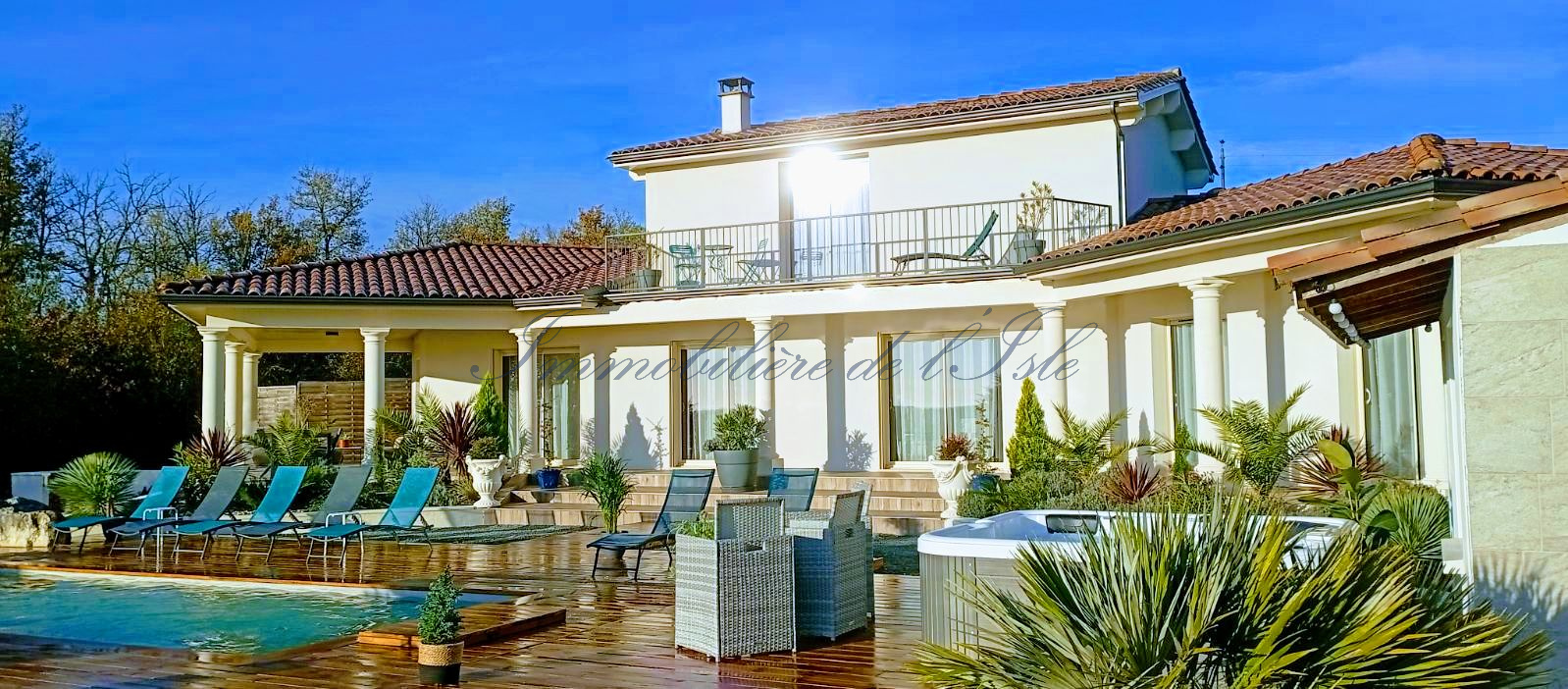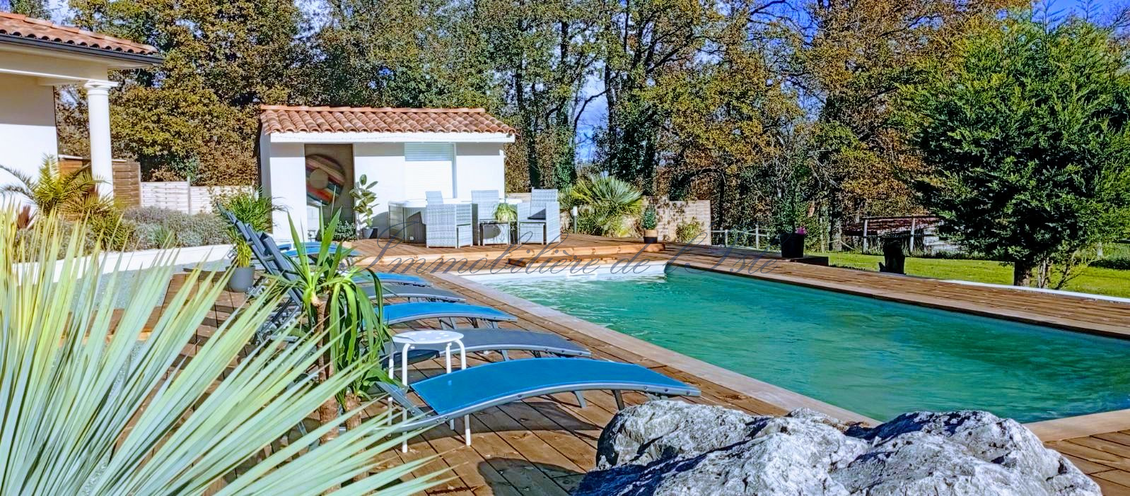 Au coeur du Périgord Vert, à 10 minutes de Ribérac et de l’étang de la Jemaye, une villa spacieuse avec de belles prestations vous offrant un beau cadre de vie, incluant piscine, jacuzzi 6 places, maison d’amis et environ 1,2 ha de terres. La maison d’une surface habitable d’environ 190m2 dispose de deux pièces de vies très lumineuses partageant un insert à double foyer, avec plusieurs baies vitrées s’ouvrant sur une terrasse spacieuse orientée Sud-Est. Une cuisine ouverte moderne, deux chambres dont une avec son espace dressing, et une salle d’eau complètent le rez-de-chaussée. A l’étage, deux autres chambres et une salle de bain, ainsi qu’un agréable balcon. Cette demeure s’ouvre sur un jardin paysagé, une piscine avec nage à contre-courant et sa plage, et une belle vue dégagée sur les 1.1 ha de prairie. De beaux éclairages extérieurs donnent à cette demeure un très beau cachet à tout moment de la journée. Une maison d’amis bénéficiant d’une entrée et d’une terrasse indépendantes dispose d’environ 43m2 de surface habitable, avec salon / cuisine, chambre et salle d’eau. Un couloir permet une communication intérieure entre les 2 maisons. Cela vous laisse la possibilité de faire du locatif sur l’une ou l’autre maison, ou de conserver l’ensemble en résidence familiale. Ce bien immobilier d’une qualité rare, situé dans un environnement calme tout en restant proche de toutes les commodités, à 1h seulement d’Angoulême avec ses infrastructures et sa gare TGV, vous offre un cadre de vie idéal, avec suffisamment de terres pour y accueillir différents projets (animaux, chevaux, maraîchage).