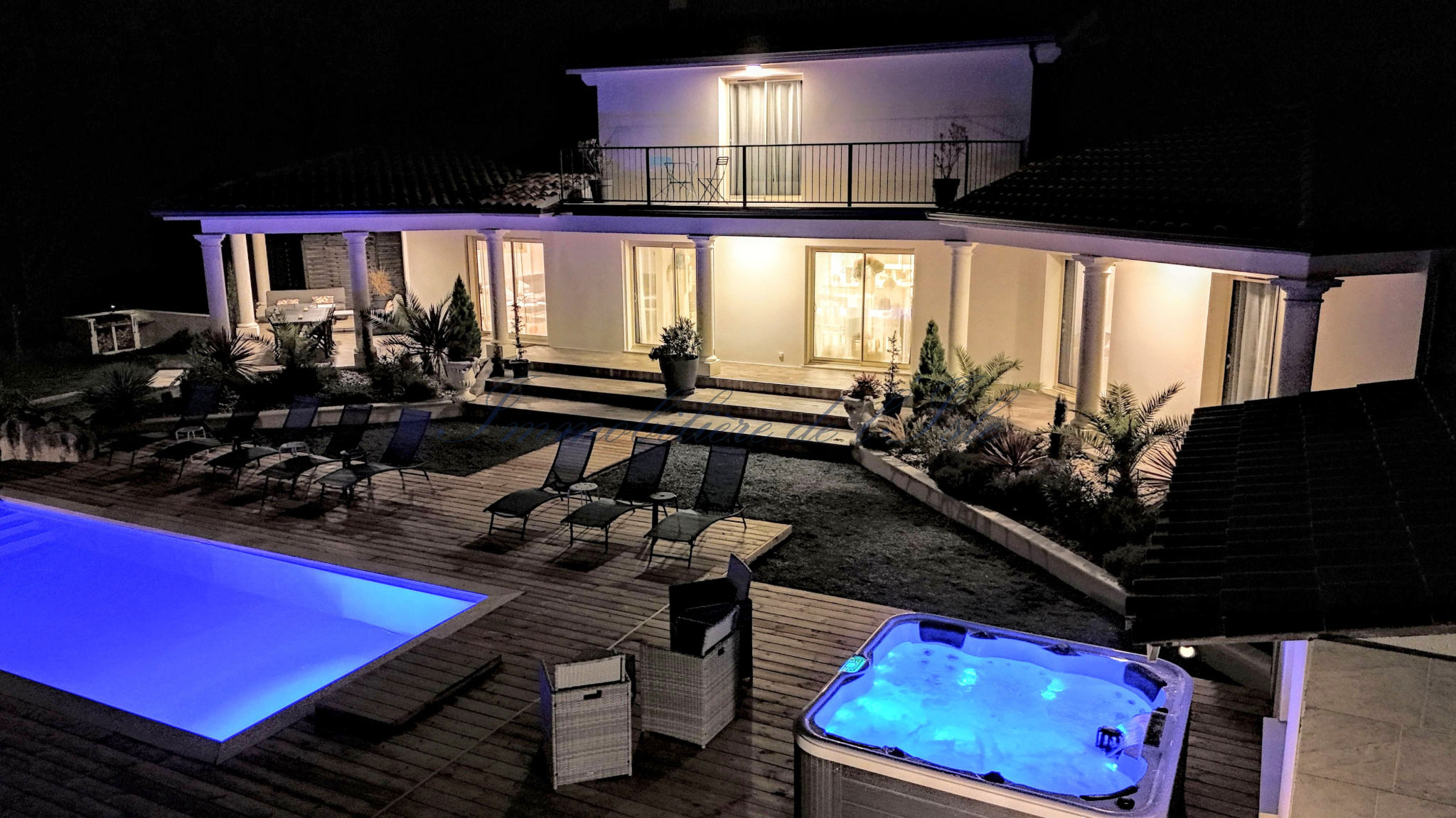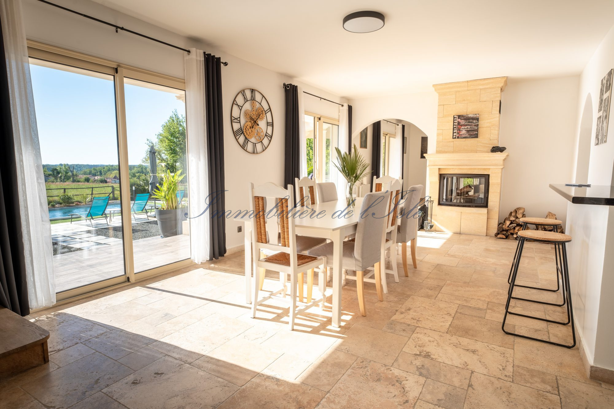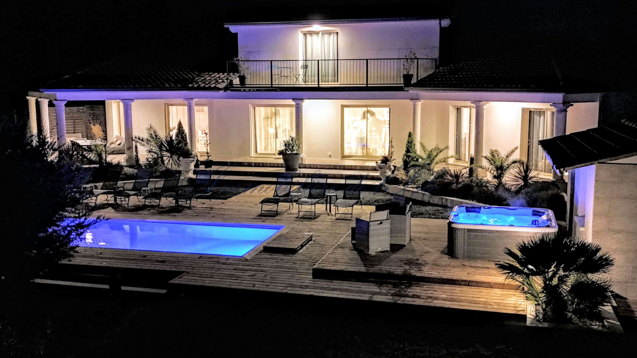 Au coeur du Périgord Vert, à 10 minutes de Ribérac et de l’étang de la Jemaye, une villa spacieuse avec de belles prestations vous offrant un beau cadre de vie, incluant piscine, jacuzzi 6 places, maison d’amis et environ 1,2 ha de terres. La maison d’une surface habitable d’environ 190m2 dispose de deux pièces de vies très lumineuses partageant un insert à double foyer, avec plusieurs baies vitrées s’ouvrant sur une terrasse spacieuse orientée Sud-Est. Une cuisine ouverte moderne, deux chambres dont une avec son espace dressing, et une salle d’eau complètent le rez-de-chaussée. A l’étage, deux autres chambres et une salle de bain, ainsi qu’un agréable balcon. Cette demeure s’ouvre sur un jardin paysagé, une piscine avec nage à contre-courant et sa plage, et une belle vue dégagée sur les 1.1 ha de prairie. De beaux éclairages extérieurs donnent à cette demeure un très beau cachet à tout moment de la journée. Une maison d’amis bénéficiant d’une entrée et d’une terrasse indépendantes dispose d’environ 43m2 de surface habitable, avec salon / cuisine, chambre et salle d’eau. Un couloir permet une communication intérieure entre les 2 maisons. Cela vous laisse la possibilité de faire du locatif sur l’une ou l’autre maison, ou de conserver l’ensemble en résidence familiale. Ce bien immobilier d’une qualité rare, situé dans un environnement calme tout en restant proche de toutes les commodités, à 1h seulement d’Angoulême avec ses infrastructures et sa gare TGV, vous offre un cadre de vie idéal, avec suffisamment de terres pour y accueillir différents projets (animaux, chevaux, maraîchage).